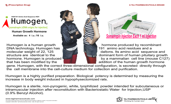 Humogen is a human growth hormone produced by recombinant DNA